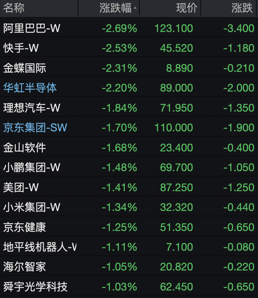 科网股全线走低,阿里巴巴、快手、 金蝶国际、 华虹半导体跌逾2%;京东集团、金山软件、小鹏集团、美团、小米集团等均跌超1%。