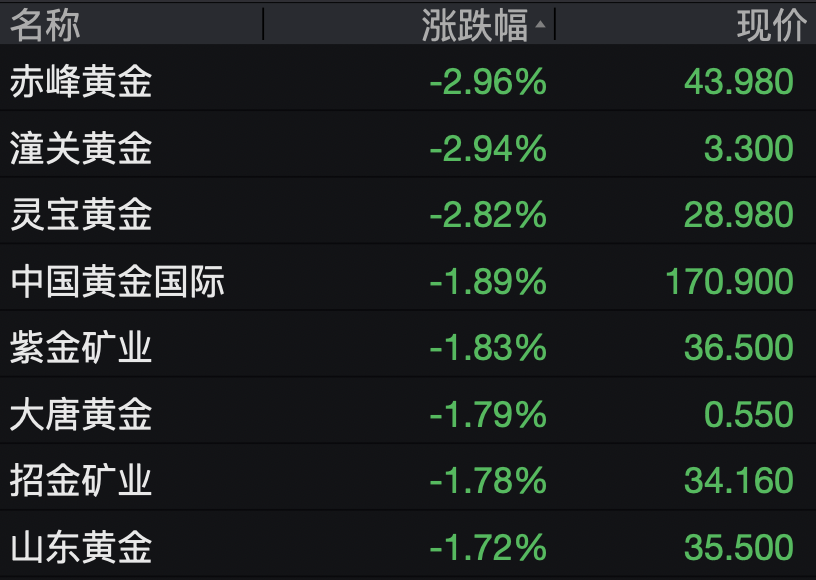 贵金属板块集体走低,赤峰黄金跌近3%,中国黄金国际、紫金矿业跌超1%。