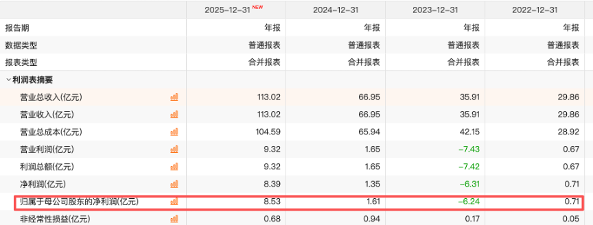 佰维存储近年业绩处于快速上升状态,2022年至2025年净利润分别为0.71亿元、-6.24亿元、1.61亿元、8.53亿元,截至2025年末货币资金余额达到17.44亿元。