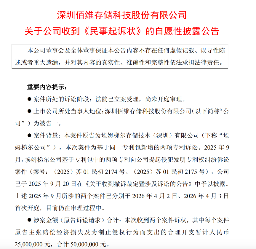 4月8日晚间,佰维存储公告称,近日收到南京中院送达的《应诉通知书》及《民事起诉状》等相关材料,案由是埃姆梯尔公司就两起侵害发明专利权纠纷起诉佰维存储及相关主体,涉案金额合计达5000万元。