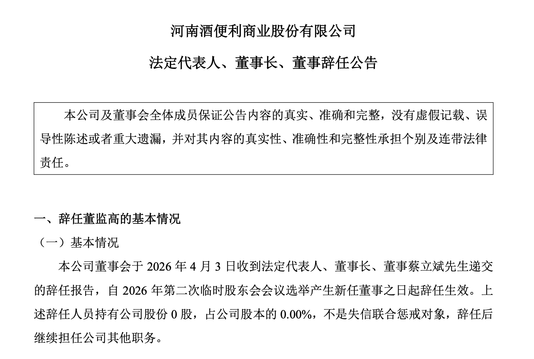 4月9日,南都湾财社-酒水新消费指数课题组记者注意到,酒便利此前发生了一次高管变更,该公司董事长蔡立斌、董事王天辉和刘雅娟辞职,并自2026年第二次临时股东会会议选举产生新任董事之日起,辞任生效。同日,酒便利方面提名陈力、熊振华、陈力越及孙闯为该公司董事。据了解,被提名的四名董事均来自酒便利的新资方“天音系”。