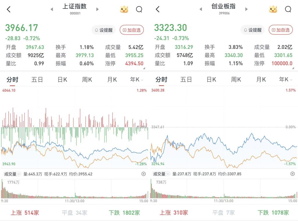 至收盘,上证综指跌0.72%,报3966.17点;深证成指跌0.33%,报13996.27点;创业板指跌0.73%,报3323.3点。