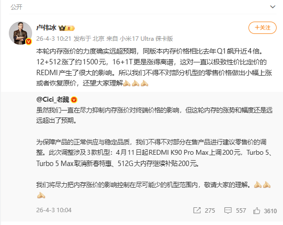 4月3日,小米集团(01810.HK)总裁卢伟冰发微博表示,本轮内存涨价的力度远超预期,同版本内存价格相比去年一季度飙升近4倍。12G+512G涨了约1500元,16+1T更涨得离谱。
