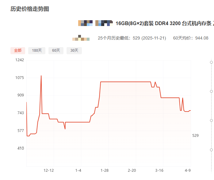 相较最高点时的1099元,该内存条的单价现已下跌约30.94%。