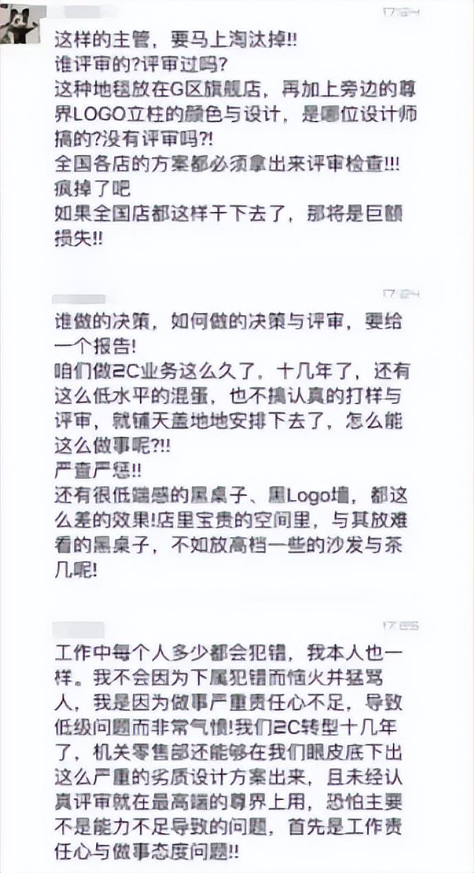他在工作群中怒斥相关工作人员:这并非单纯的能力不足,而是严重的责任心缺失。他说:“我因做事严重责任心不足,导致低级问题而非常气愤!”在他看来,华为转型消费者业务已有十几年,零售部门却在眼皮底下拿出劣质方案且未严格评审,这是态度问题。