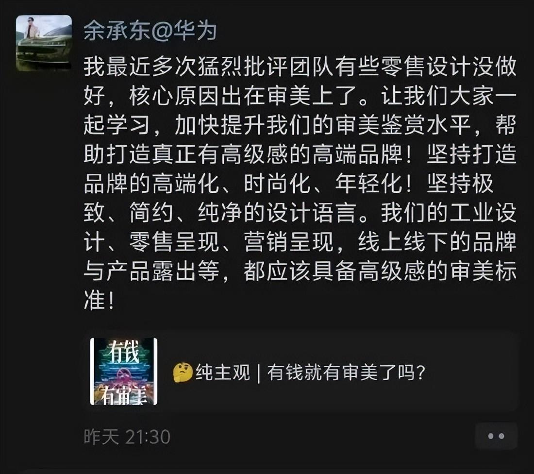 2026年4月8日,一张华为终端BG董事长余承东的朋友圈截图在科技圈刷屏。“我最近多次猛烈批评团队有些零售设计没做好,核心原因出在审美上了。”他要求全员加快提升审美鉴赏水平,打造真正具备“高级感”的高端品牌。在余承东的定义中,未来的华为要坚持极致、简约、纯净的设计语言,实现品牌的高端化、时尚化与年轻化。