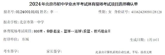 1月17日选项结束后,学校下载并打印初中体育现场考试项目选择确认单,考生及家长签字后交给学校。