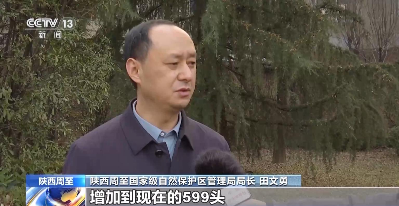 陕西周至国家级自然保护区管理局局长 田文勇:现在通过调查,熊猫的数量增加到50多只。羚牛由原来的400头增加到现在的599头。金钱豹有10多只,还有林麝。