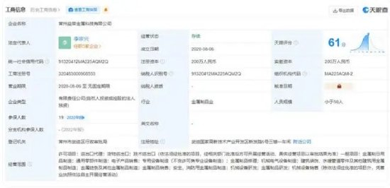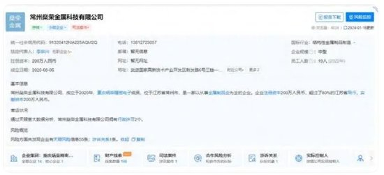 据天眼查信息,该公司成立于2020年,重庆炳荣精密电子成员,位于江苏省常州市,是一家以从事金属制品业为主的企业。企业注册资本200万人民币,实缴资本200万人民币;风险方面共发现企业有天眼风险信息55条,涉诉关系1条。