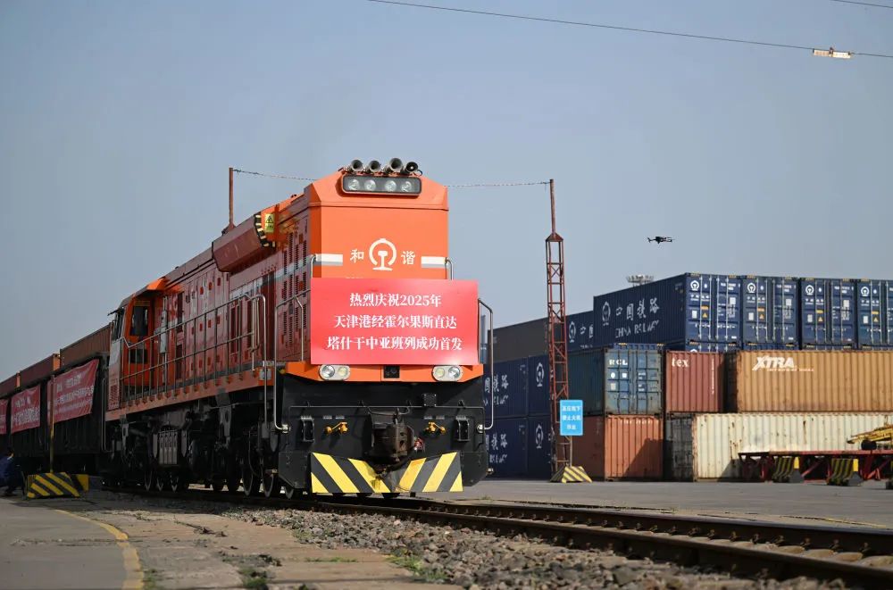 2025年首列天津港经霍尔果斯直达乌兹别克斯坦的中亚班列发车。新华社记者 赵子硕 摄