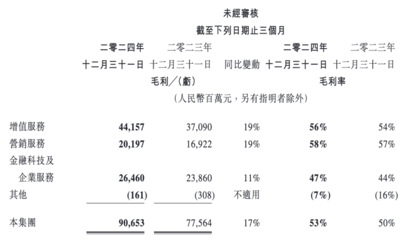 广告收入方面,四季度营销服务业务同比增长17% 至350亿元,与游戏业务共同拉动了腾讯营收增长。