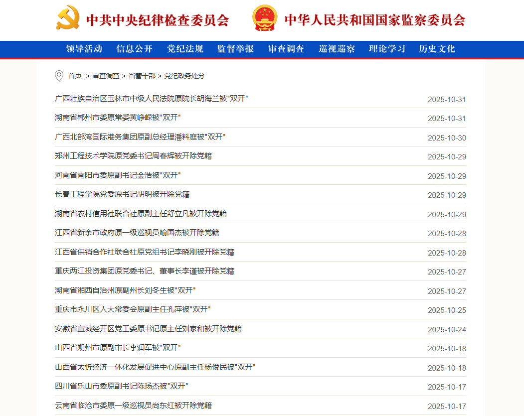 此外还有:广西壮族自治区玉林市中级人民法院原党组书记、院长胡海兰被开除党籍和公职,湖南省农村信用社联合社原党委委员、副主任舒立凡被开除党籍,重庆两江投资集团原党委书记、董事长李谨被开除党籍,大连海关原党委书记、关长刘大立被开除党籍和公职,中国中纺集团有限公司原党委书记、董事长刘云被开除党籍和公职,等等。