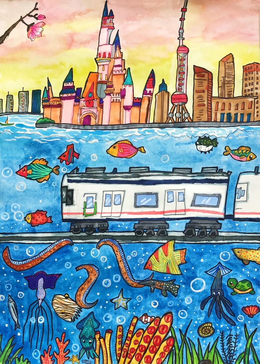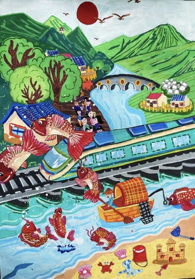 不远处徐盐高铁上,银白色的高铁像一道流星划过水乡。我的铅笔在本子上沙沙作响,把窗外的景色画下来:成片的藕田里,粉白的荷花摇曳生姿;戴着斗笠的农民在稻田里忙碌,身后的水渠泛着粼粼波光。列车员阿姨推着小推车走来,“瓜子饮料矿泉水”的吆喝声,和车轮与钢轨的碰撞声交织在一起,成为独属于旅途的音乐。