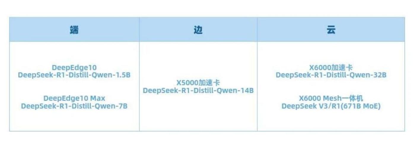DeepSeek-R1-Distill-Qwen-1.5B、DeepSeek-R1-Distill-Qwen-7B、DeepSeek-R1-Distill-Llama-8B大模型的适配,可以交付客户使用。DeepSeek-R1-Distill-Qwen-32B、DeepSeek-R1-Distill-Llama-70B大模型、DeepSeek V3/R1 671B MoE大模型也在有序适配中。适配完成后,DeepEdge10芯片平台将在端、边、云全面支持DeepSeek全系列模型。