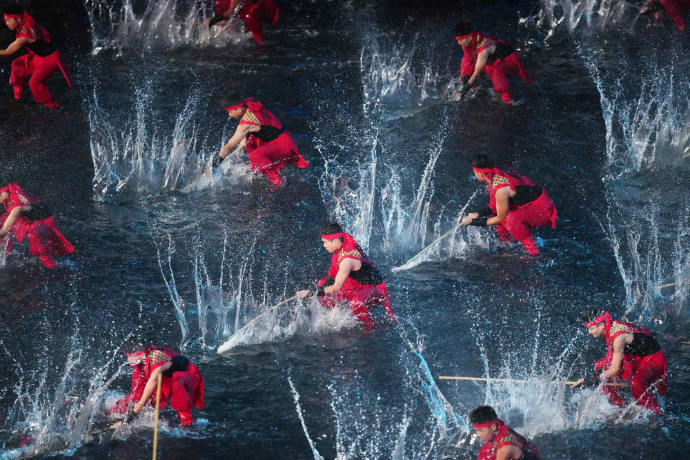 咏春、南拳……传统武术轮番登场。水面之上,武者持棍操练,水花激荡。“岭南有习武传统,通过锤炼体魄收获自信与精气神。”白衣侠士扮演者谢苗说。