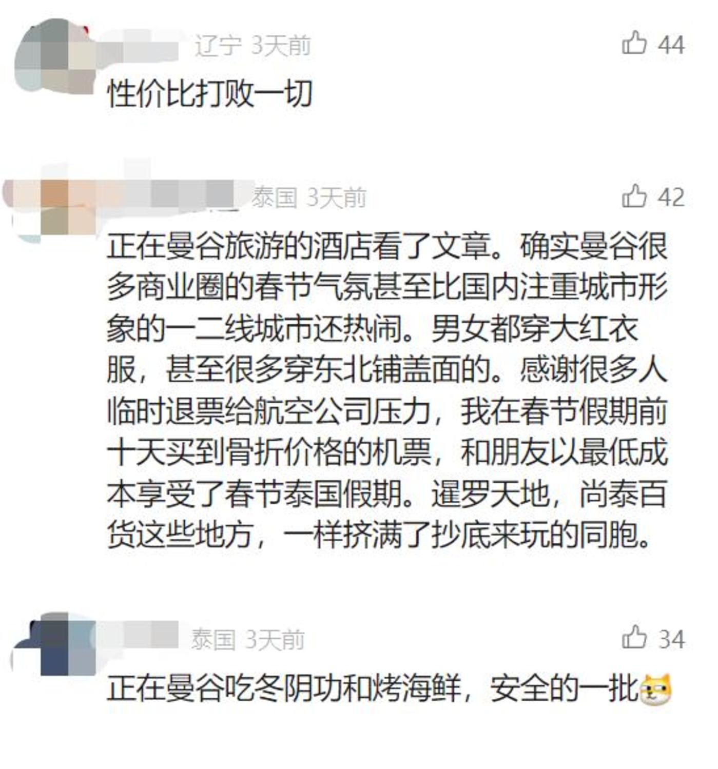 有因退票潮而“抄底”的网友表示,由于很多人临时退票给航空公司压力,居然在假期前10天买到了骨折价格的机票,和朋友以最低成本享受了春节泰国游。