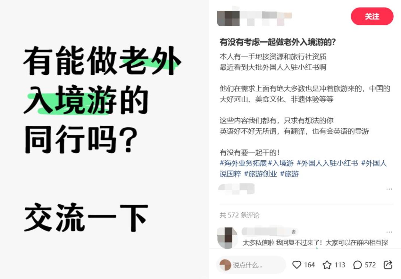 “趣解商业”观察到,市面上还出现了一些面向外国游客的入境游策划工作室,还有些网友在小红书上招募入境游策划的“创业搭子”。
