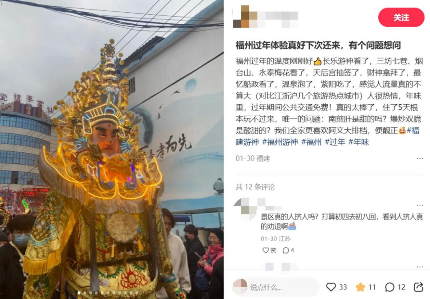 一名广西的网友,今年为了看游神,带着全家老小自驾800公里来到福建长乐市仙富村,感受“咚咚咚”的氛围;他表示,一共在这里住了5天,体验非常好,气温合适,而且公交地铁过年期间全部免费,去了三坊七巷、烟台山、天后官,还泡了温泉,根本玩不过来。