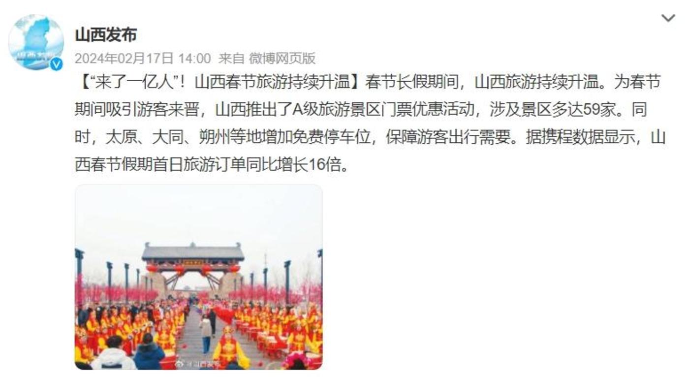 根据山西省文化和旅游厅统计的数据,2025年春节假日期间山西省共接待国内游客2837.97万人次,同比增长22.20%;实现旅游总花费317.44亿元,同比增长30.03%。忻州古城、小西天等黑悟空取景地,都呈现“人从众”的状态;长治县举办的黑悟空相关灯会,也吸引了不少用户打卡。