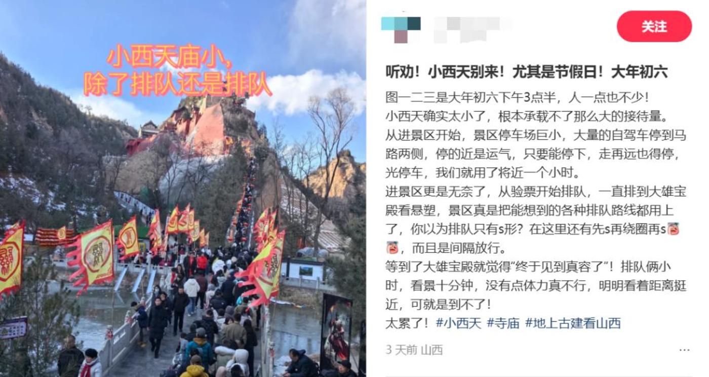 《黑神话:悟空》中 “既见未来,为何不拜” 的名场面取景于隰县“小西天”寺庙;然而,今年由于客流量较大,正月初八小西天庙会未能向外地游客开放核心景点“大雄宝殿”。有网友在社媒平台上表示,山西文旅在应对旅游高峰、提升游客体验上还有待加强。