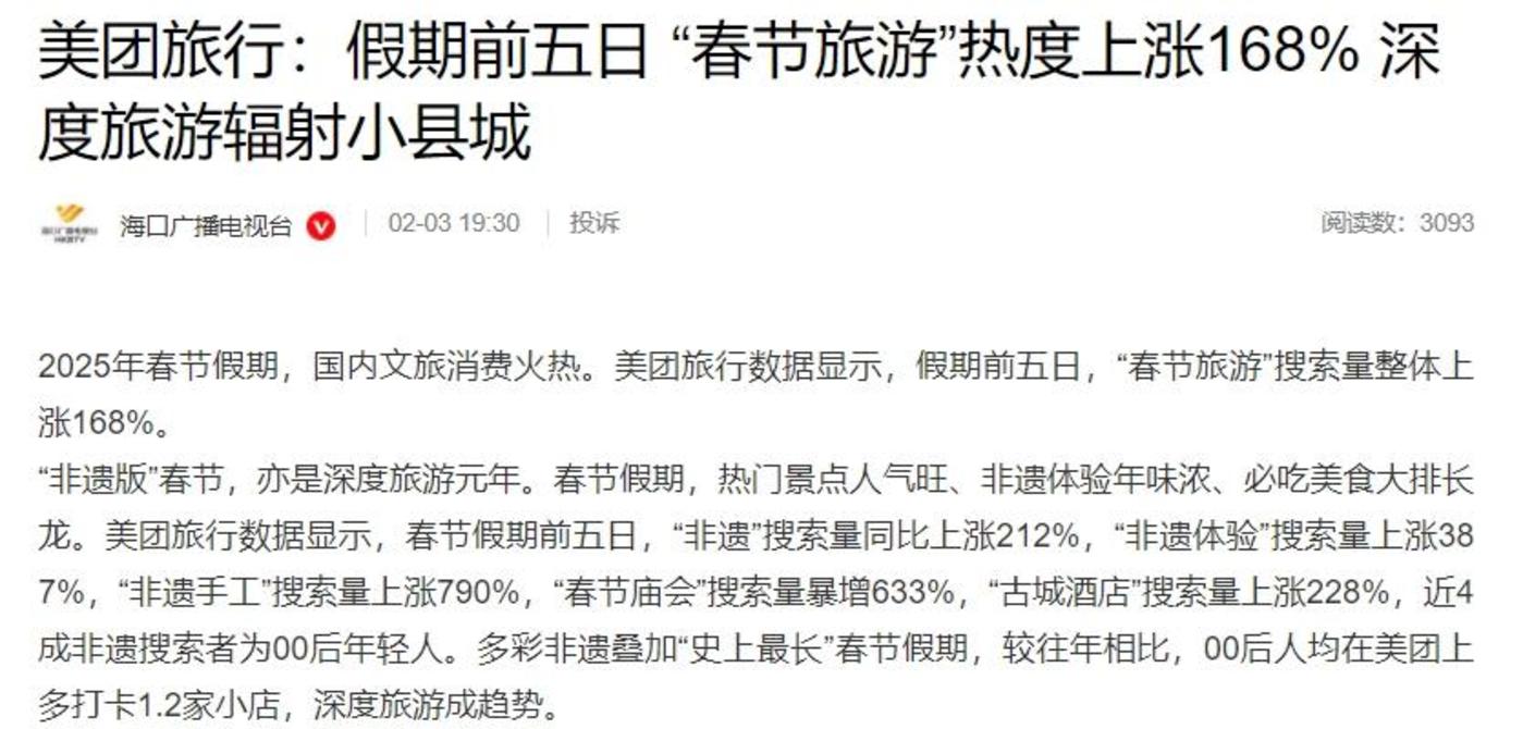 携程发布的《2025春节旅游总结报告》提到,非遗年味目的地例如石家庄、福州、西安的入境游订单,同比去年春节分别增长50%、52%、97%;途家民宿数据显示,截至2月4日,有51个乡镇第一次迎来了外国游客的订单。
