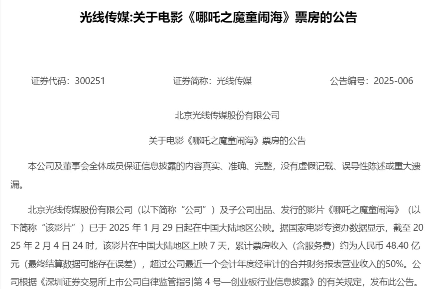 此前的2月5日,光线传媒发布公告称:据国家电影专资办数据显示,截至 2025 年 2 月 4 日 24 时,《哪吒2》在中国大陆地区上映 7 天,累计票房收入(含服务费)约为人民币 48.40 亿元(最终结算数据可能存在误差),超过公司最近一个会计年度经审计的合并财务报表营业收入的50%。截至 2025 年 2 月 4 日,公司来源于该影片的营业收入区间约为人民币 9.50 亿元至人民币 10.10 亿元(最终结算数据可能存在误差)。