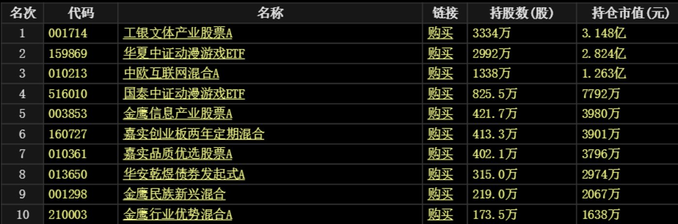 在光线传媒持仓前10基金中,国泰中证动漫游戏ETF持有825.5万股,金鹰基金旗下3只产品合计持有814.2万股,嘉实基金旗下两只产品合计持有815.4万股,华安乾煜债券发起式A持有315万股。