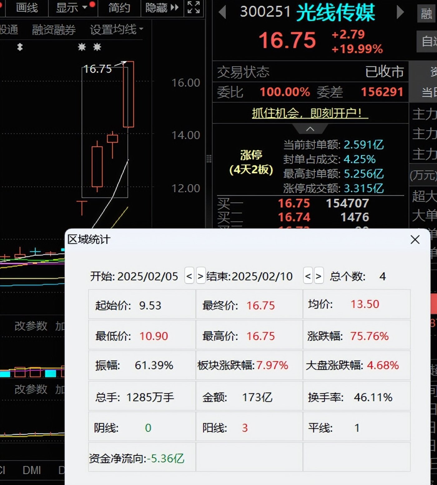 春节前收盘,光线传媒的股价9.53元,总市值279.6亿元。截至2月10日收盘,公司股价16.75元,总市值491.4亿元。年后短短4个交易日,公司股价涨幅75.76%,市值增加211.8亿元。
