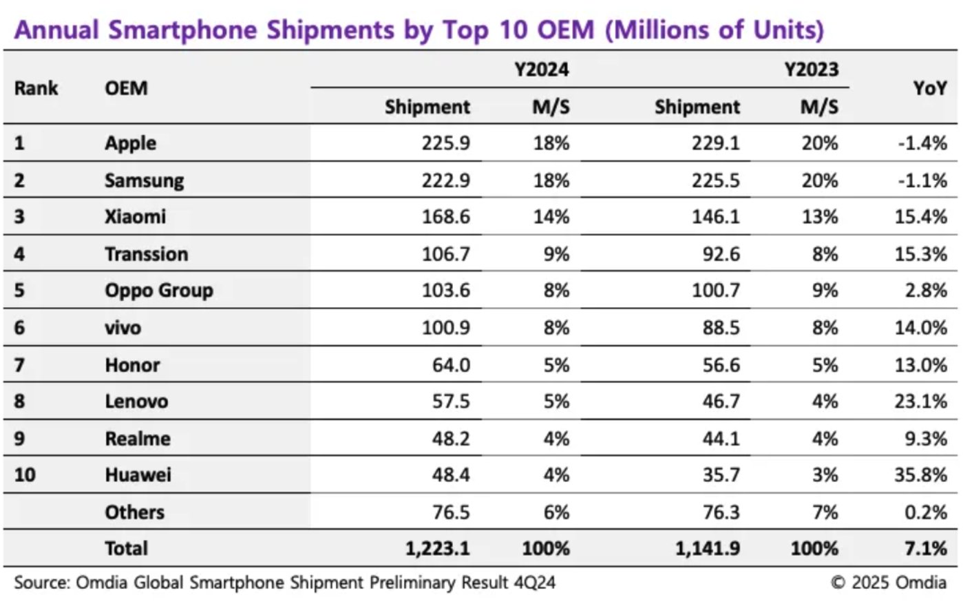 OPPO在整体出货量上与vivo几乎持平,2024年整体增长2.8%,总销量从2023年的1.01亿台增至1.04亿台。笔者注意到,Omdia在统计中将一加的销量也合并到了OPPO当中,但榜单中的其他子品牌如Realme,则是独立统计的,后者出货量为4820万台,与华为的出货量几乎相当。
