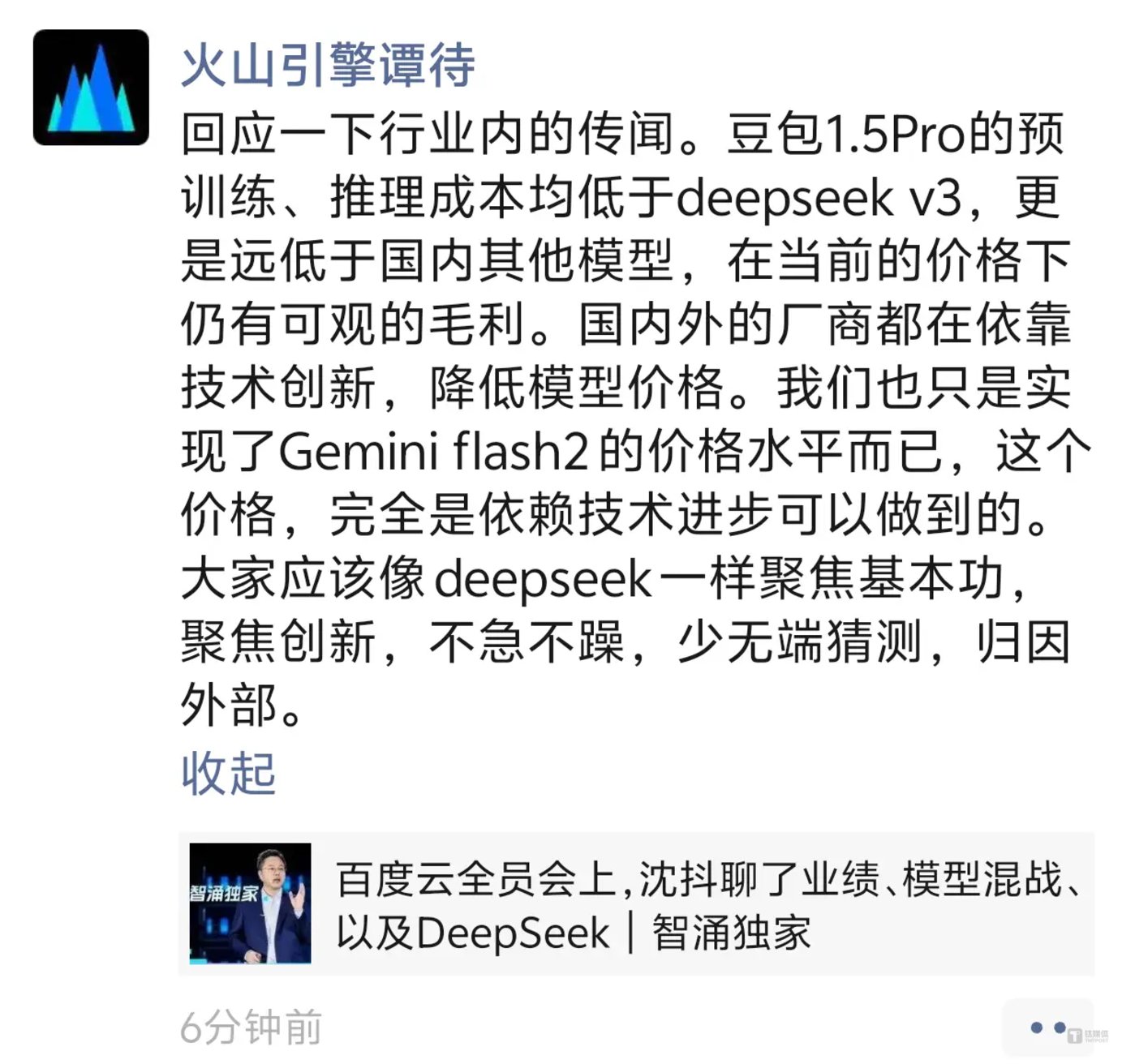 火山引擎总裁谭待首次回应百度沈抖对于“卷”大模型低价以及DeepSeek冲击的观点。
