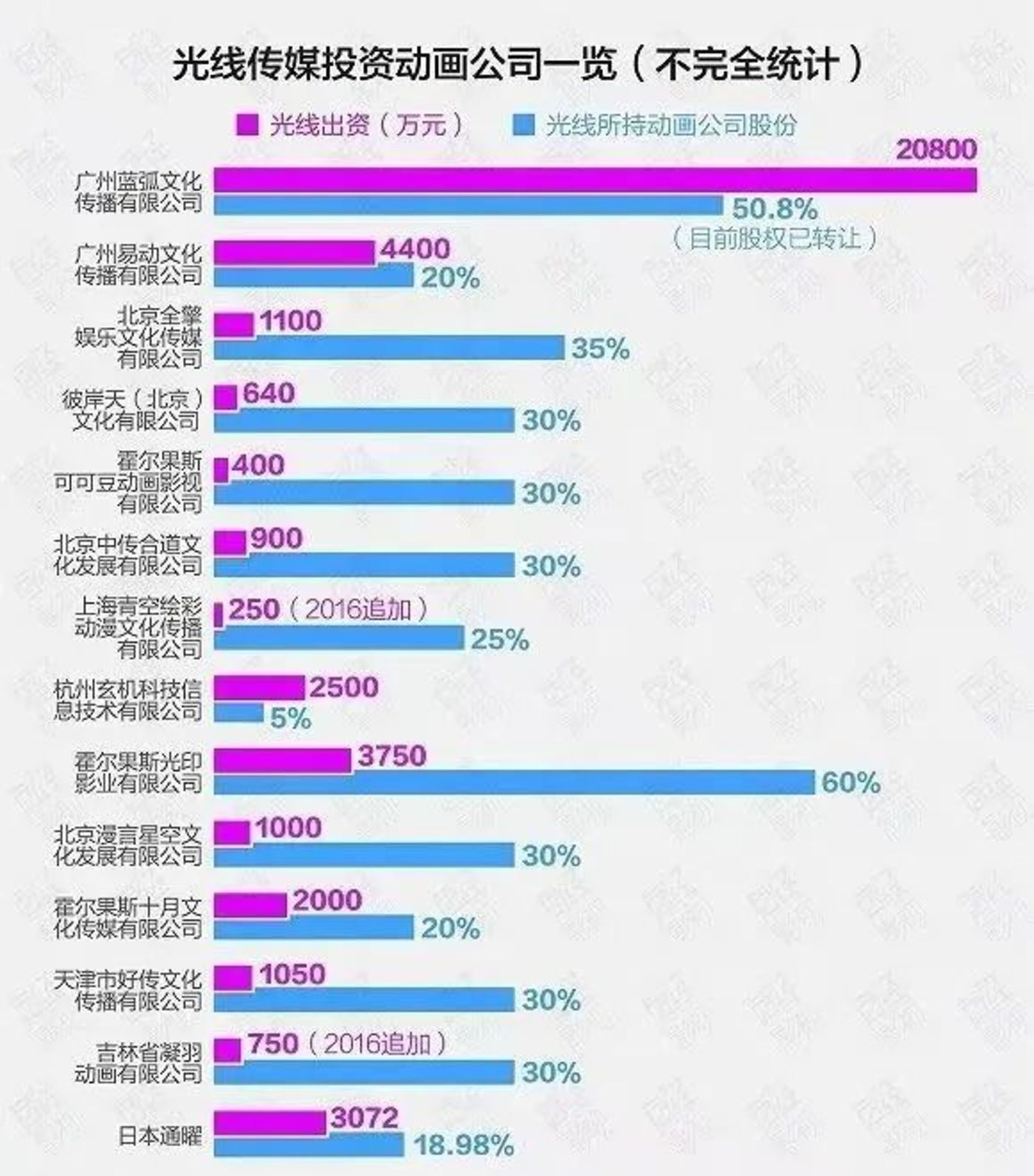 早在2014年,光线就以2.08亿元收购蓝弧文化50.8%股权的方式,开始进军动画领域。转年,看到了国产动画巨大市场潜力的光线传媒,最终选择成立全资公司彩条屋,开始加大在动画上的投入。随后几年,以彩条屋为核心,光线全面铺开了动画业务的布局,接连收购或成立了包括彼岸天、光印影业在内超过20家动画公司,遍布动画、版权、漫游等多个领域。