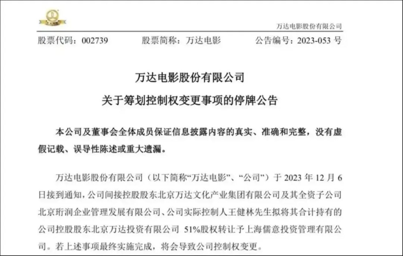 然而,2023年12月6日,万达电影发布公告,宣布公司实际控制人王健林拟将其合计持有的公司控股股东北京万达投资有限公司51%股权转让予上海儒意投资管理有限公司。在此之前,上海儒意影视制作有限公司便以22.62亿元的对价,收购了万达投资49%的股权。中国儒意,成为了万达电影实际控制人。