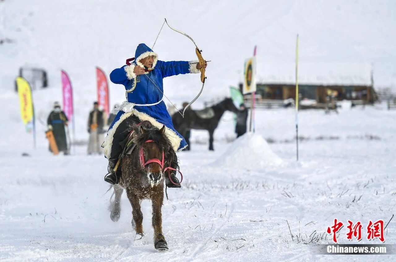 新疆禾木:牧民表演骑马射箭。刘新 摄
