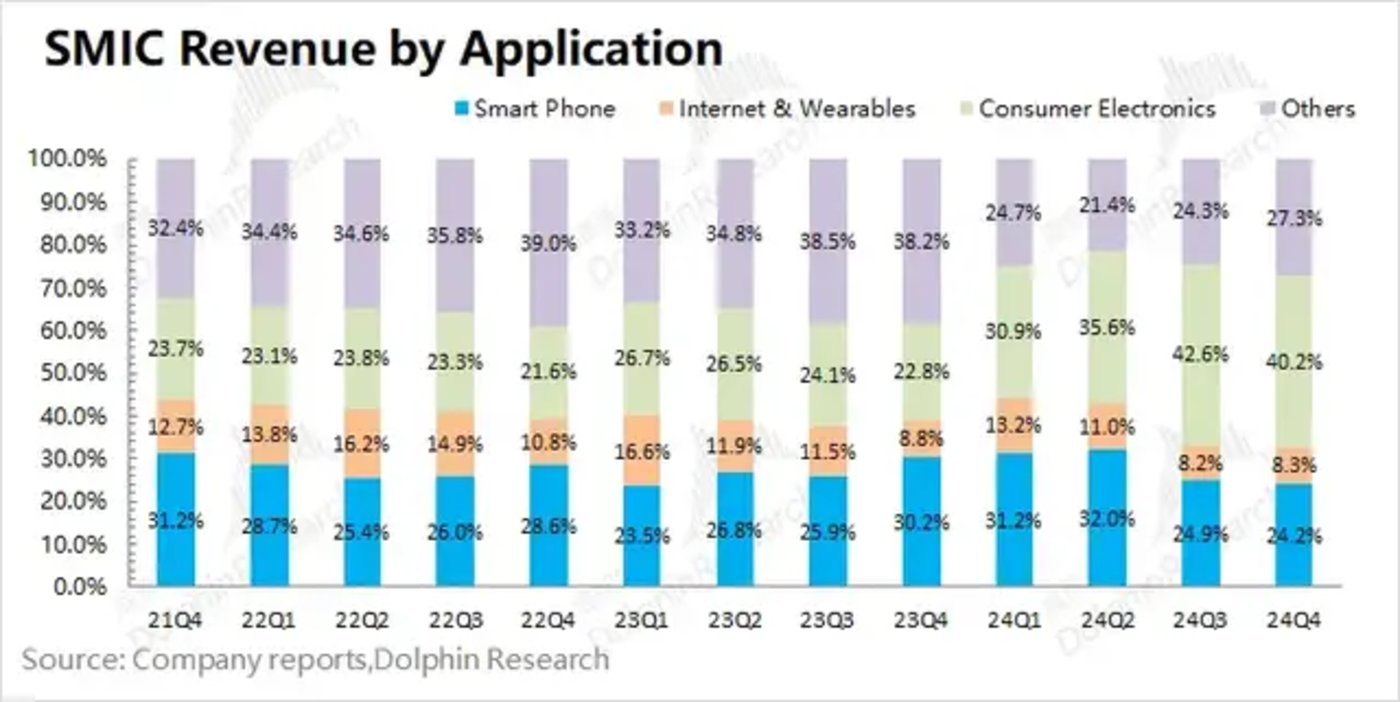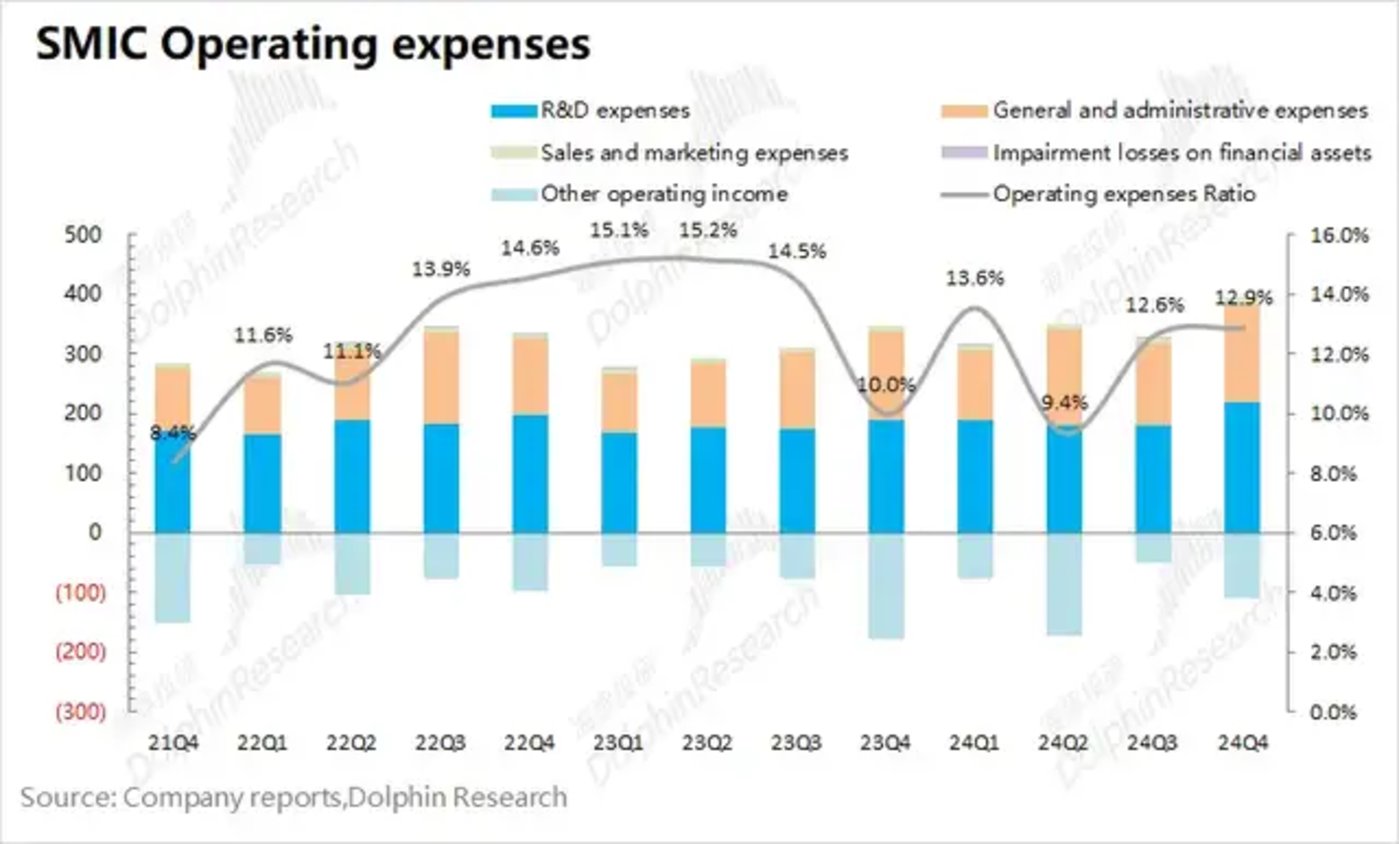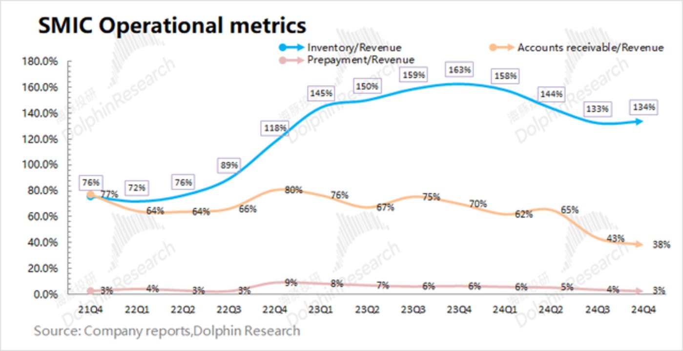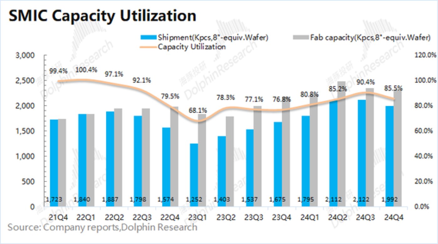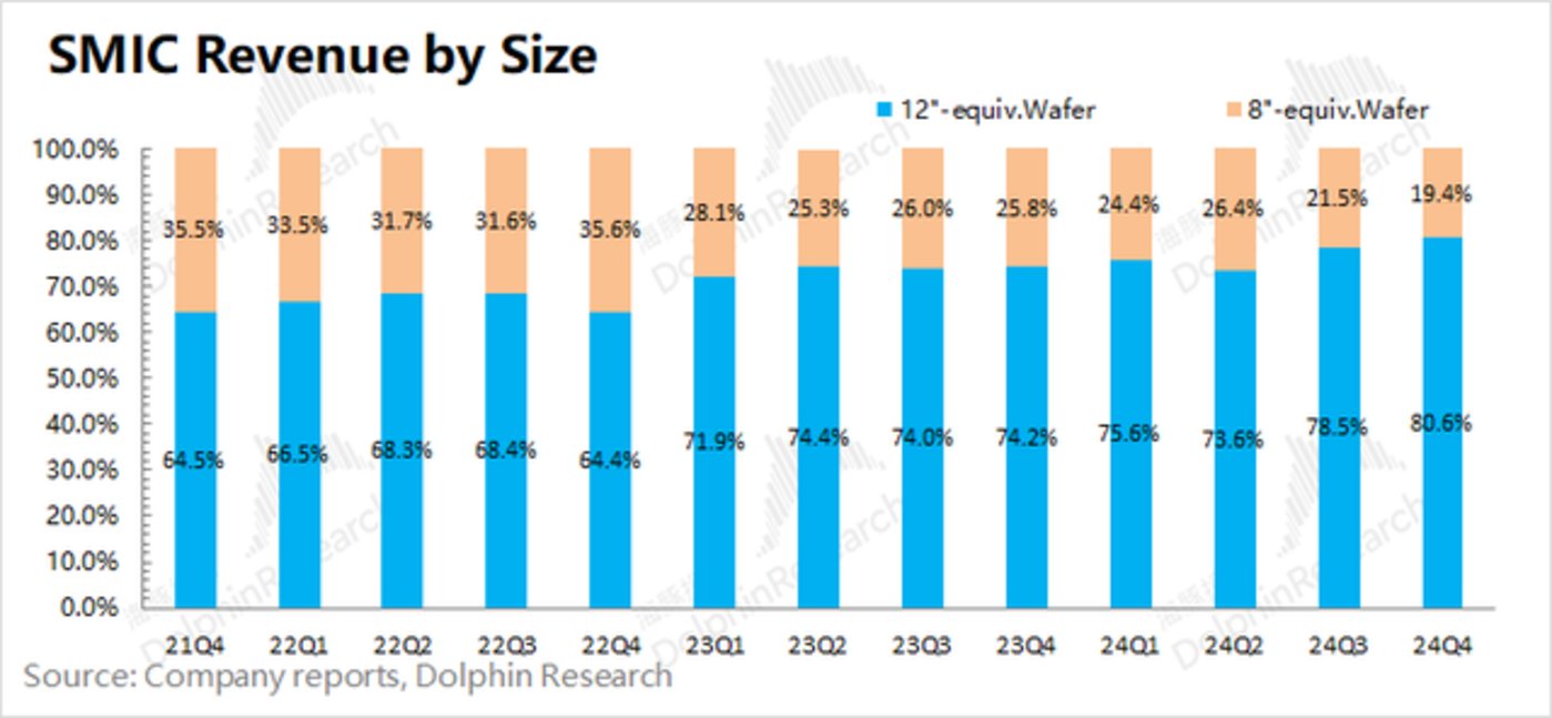 2024年第四季度中芯国际的产能利用率85.5%,本季度公司的产能利用率有所回落。海豚君认为当前需求面仍显结构化特征,其中公司12寸晶圆需求相对不错,而8寸晶圆需求仍旧低迷,这直接影响了公司本季度的产能利用率。