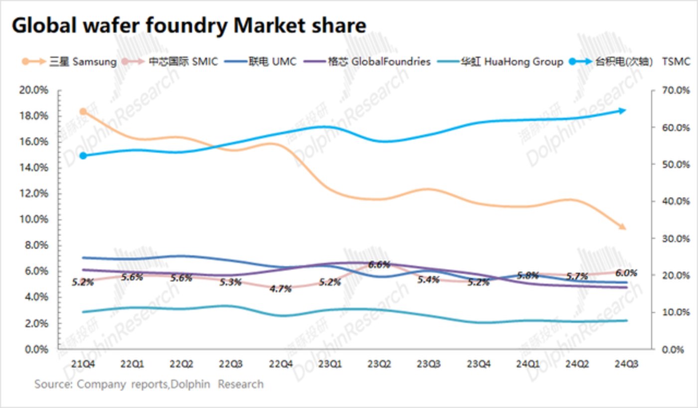 此外,海豚君也认为中芯国际的股价持续上升,也和市场对公司的认知发生变化有关。从全球晶圆市场的份额角度来看,除台积电份额持续提升以外,只有中芯国际还是稳中有升的。前6大公司中,联电的收入体量最接近于中芯国际,但两者却有明显不同:1)联电的市场份额是在下滑的,而中芯国际有所提升;2)中芯国际受益于国产化转单等需求推动;3)中芯国际已经具备进入10nm及以下技术的能力。因此,在确定性和成长性角度,中芯国际当前都优于联电,市场也给予了中芯国际相对更高的估值。