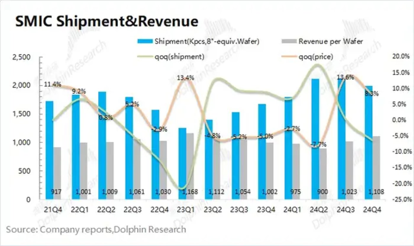 2024年第四季度中芯国际实现营收22.07亿美元,环比增加1.7%,符合指引区间(环比增长0-2%)。公司本季度的出货量环比有所回落,而价格端环比继续明显提升。