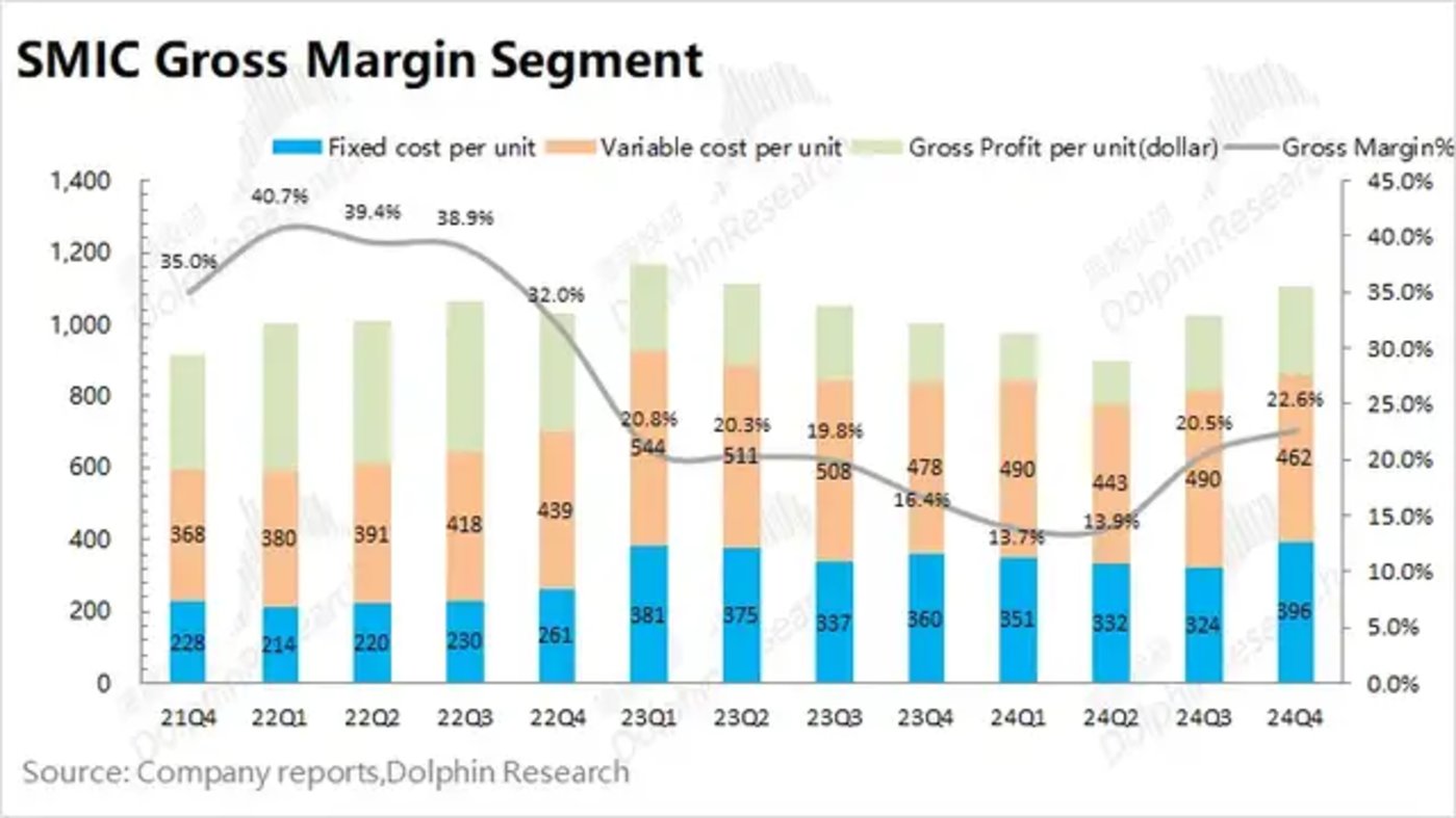 2024年第四季度中芯国际的毛利率为22.6%,环比提升2.1pct,好于市场一致预期(19.1%),超出指引区间上限(18-20%)。
