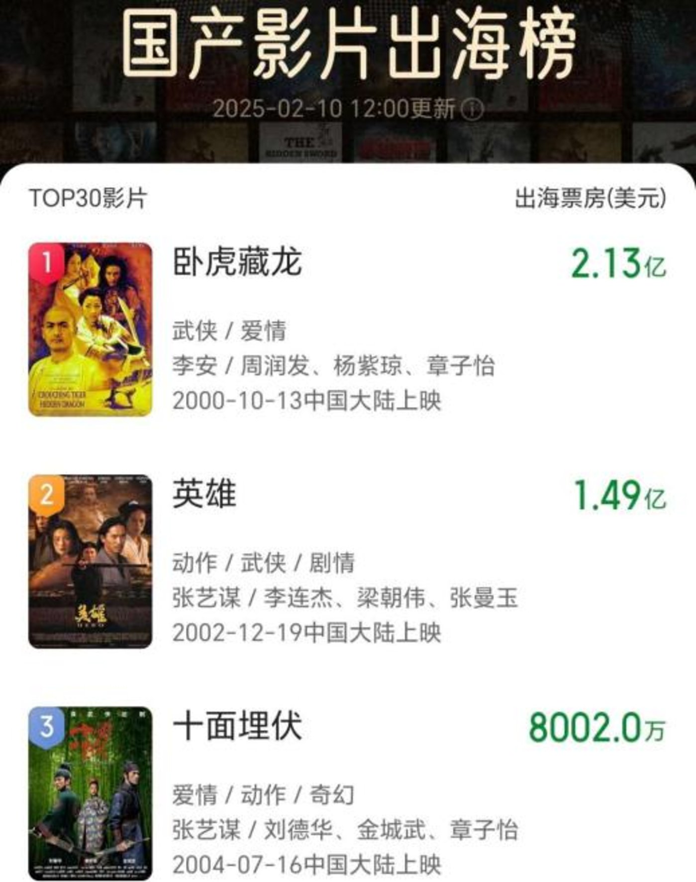第二,票房不变。中国电影(华语电影)出海票房榜上,排名前列的仍旧是20年前诞生的电影,如《卧虎藏龙》《英雄》《十面埋伏》《红番区》。《流浪地球2》的1000万美元+,已经难能可贵。