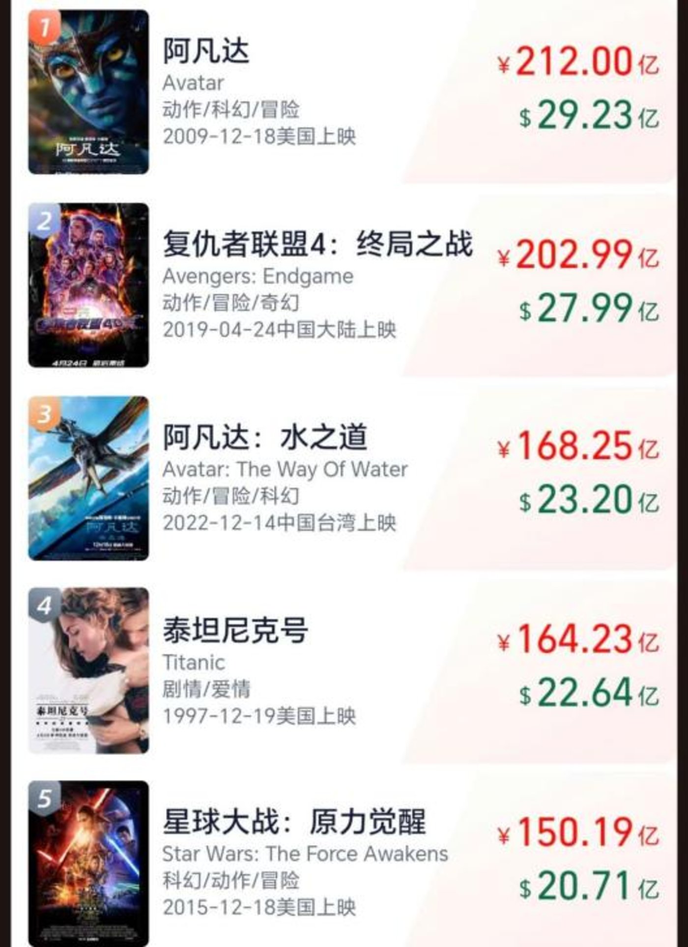 这也让过去几十年,行业内一直有一个共识:只靠本土市场,要与好莱坞相比肩,难如登天。毕竟就连2017年的《战狼2》(8.01亿美元),也未能跻身全球票房榜前50。它不仅不及《星球大战:原力觉醒》在北美单一市场的票房(9.36亿美元),甚至只有榜首《阿凡达》(29.23亿美元)的三分之一不到。