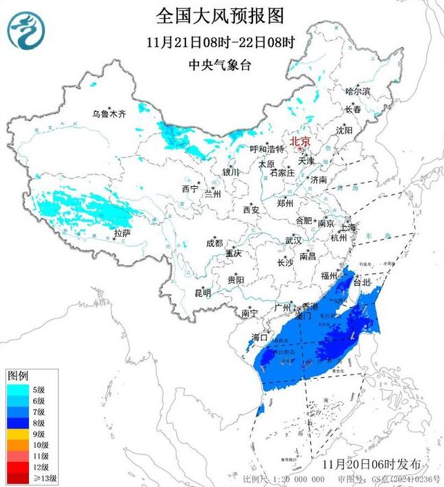 11月21日8时至22日8时,内蒙古西部、甘肃北部、新疆北疆东部、西藏中西部等地部分地区将有5~6级风,阵风7~8级;台湾海峡、台湾以东洋面偏南海域、巴士海峡、南海北部和中部海域将有7~8级、阵风9级的大风。