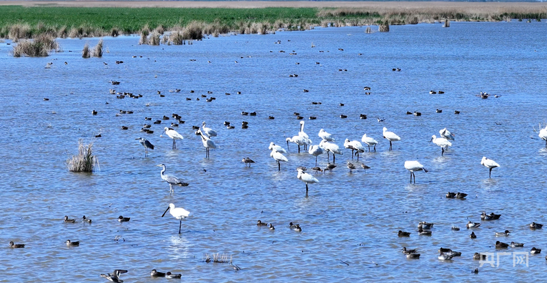 成群的鸟类在湿地水面上嬉戏(央广网见习记者 张润 摄)