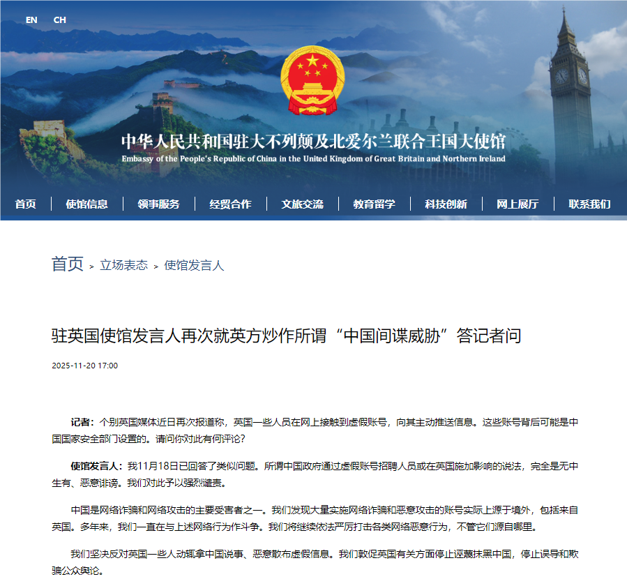 使馆发言人:我11月18日已回答了类似问题。所谓中国政府通过虚假账号招聘人员或在英国施加影响的说法,完全是无中生有、恶意诽谤。我们对此予以强烈谴责。