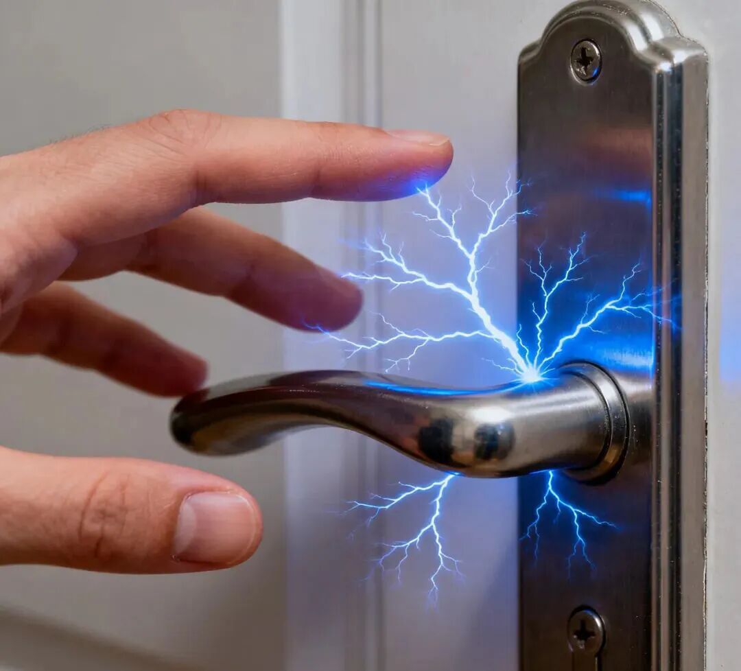 静电并不是人体产生的,而是人在活动时因摩擦而产生的,在空气干燥的情况下更容易产生。冬日空气湿度迅速降低,当环境湿度小于30%的情况下,空气中的水汽难以传导电荷,原本容易消散的静电会大量停留在物体或人体表面,门把手、楼梯扶手、毛衣、头发等似乎处处带电。