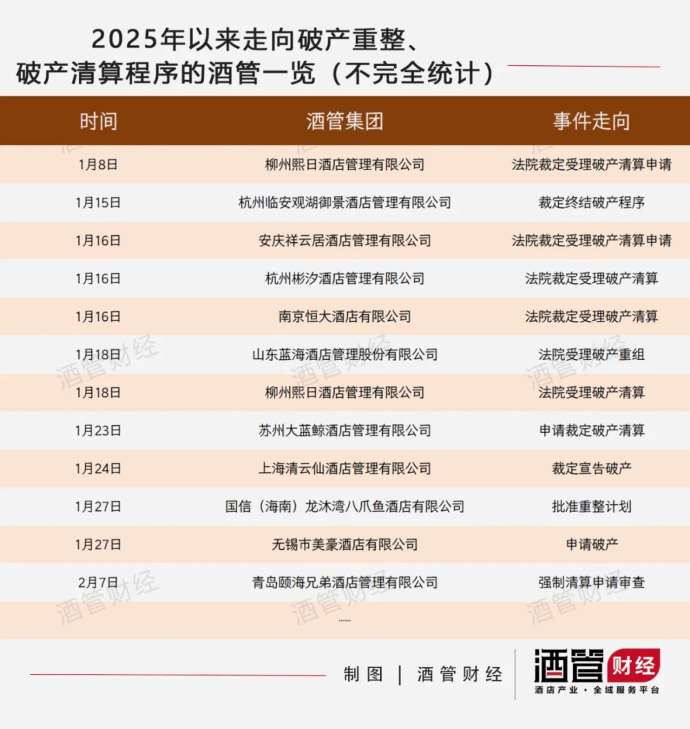 根据《酒管财经》不完全统计,进入2025年以来,已有接近20家酒管走向破产重整、破产清算的程序。这包括山东蓝海、南京恒大酒店、无锡美豪酒店等。