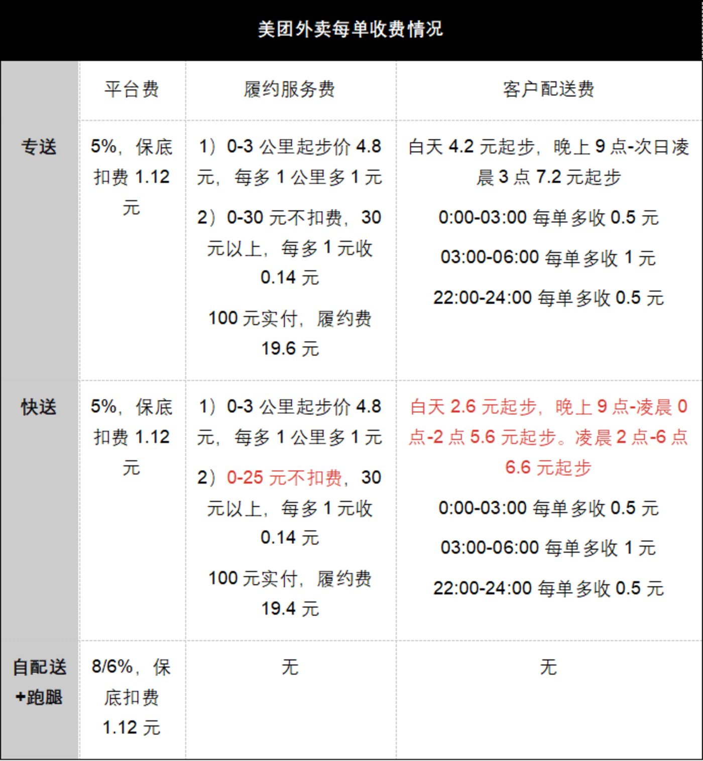 实际上,平台只是免去了本就不高的“平台费”,而履约服务费和配送费才是每单外卖最主要的开销。例如,美团将所有费用分化为平台费(佣金)、履约服务费(自配没有)、客户配送费三类。