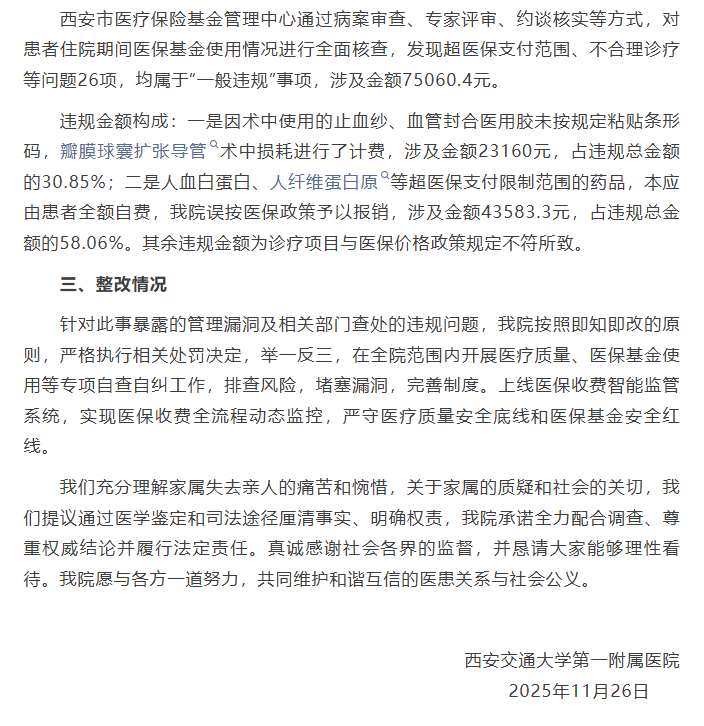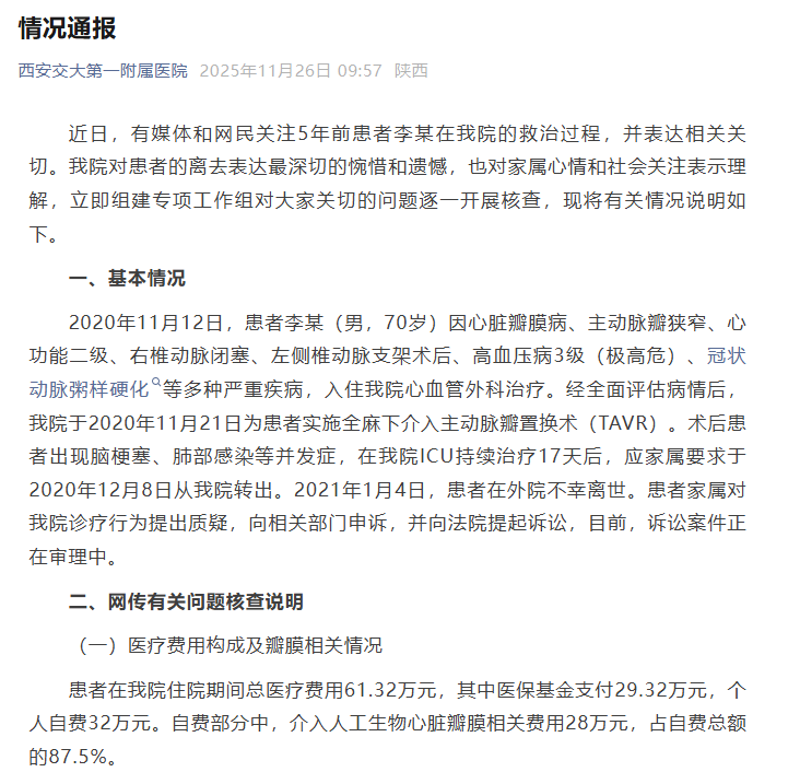 11月26日,西安交大第一附属医院发布情况通报: