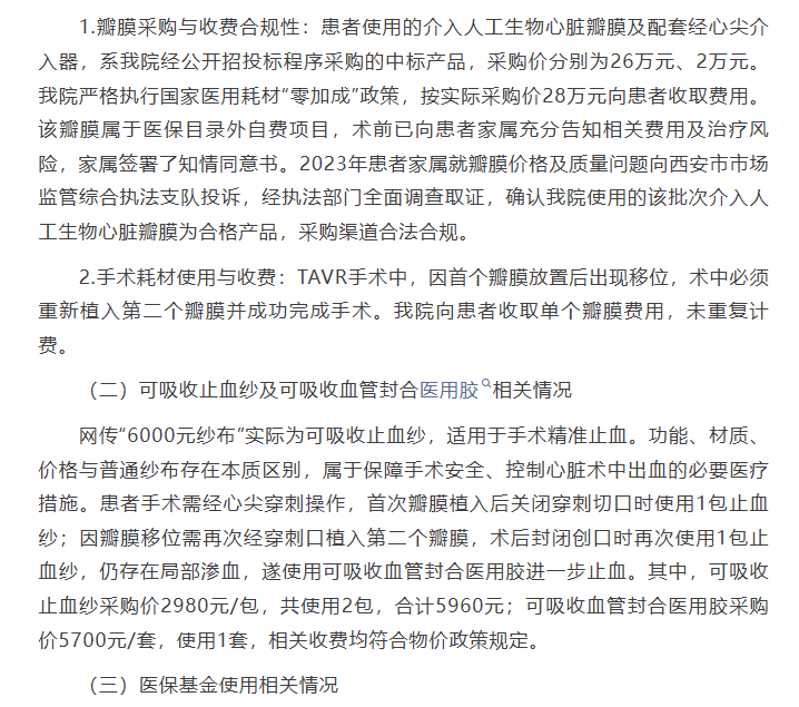 1.瓣膜采购与收费合规性:患者使用的介入人工生物心脏瓣膜及配套经心尖介入器,系我院经公开招投标程序采购的中标产品,采购价分别为26万元、2万元。我院严格执行国家医用耗材“零加成”政策,按实际采购价28万元向患者收取费用。该瓣膜属于医保目录外自费项目,术前已向患者家属充分告知相关费用及治疗风险,家属签署了知情同意书。2023年患者家属就瓣膜价格及质量问题向西安市市场监管综合执法支队投诉,经执法部门全面调查取证,确认我院使用的该批次介入人工生物心脏瓣膜为合格产品,采购渠道合法合规。