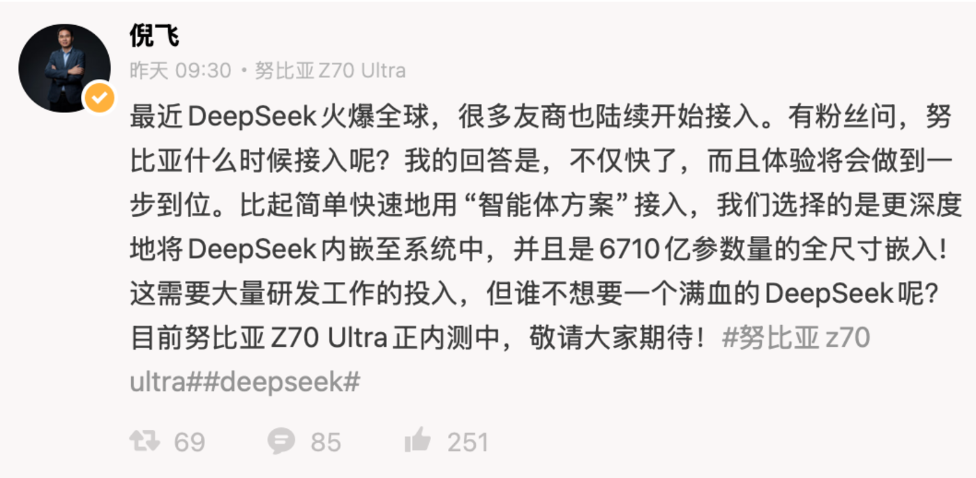 2月10日,中兴通讯终端事业部总裁倪飞在个人微博宣布,努比亚手机将接入春节以来爆火的DeepSeek R1大模型,中兴旗下另一手机品牌红魔也不会缺席。同一天,vivo官方向「电厂」确认也会接入DeepSeek R1。