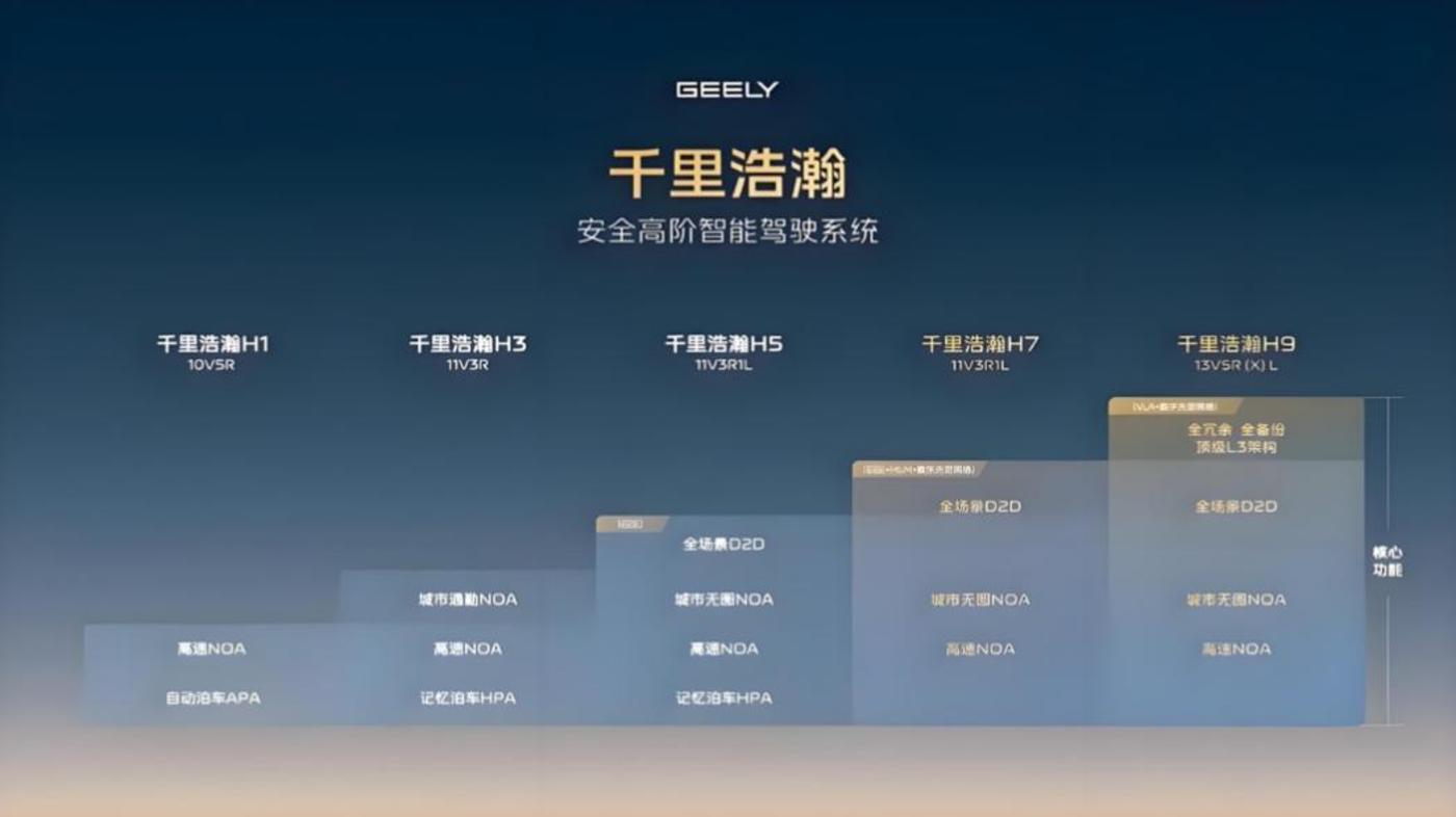 多方赋能下,今年3月3日,吉利正式发布全新“AI+智驾”品牌——千里浩瀚,分为H1、H3、H5、H7、H9五个层级,被看做精准对标比亚迪“天神之眼”。