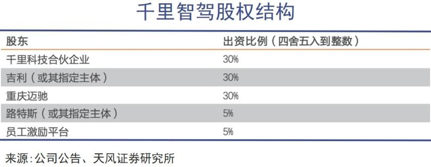 今年3月2日,千里科技联手吉利、重庆迈驰、路特斯、江河汇、重庆国资产业基金等,共同投资设立千里智驾公司。